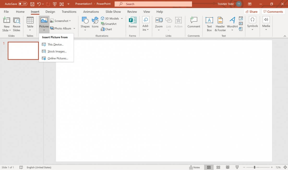 – Đối với các phiên bản củ, sẽ có 3 nguồn ảnh để bạn lựa chọn. Bao gồm ảnh có sẵn trong máy (This Device), kho ảnh có sẵn trong phần mềm (Stock Images) và thêm ảnh bằng cách thêm đường dẫn online (Online Pictures). Đối với phiên bản PP 2010, nguồn ảnh Stock Images sẽ được thay bằng nguồn Screenshot (ảnh chụp bằng màn hình).