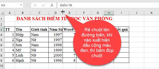 – Giả sử như ở đây mình muốn cho cột Năm sinh giãn ra, thì mình sẽ rê chuột lên đường biên bên phải của cột Năm sinh, khi nào xuất hiện dấu cộng màu đen thì mình sẽ bấm đúp chuột.