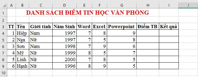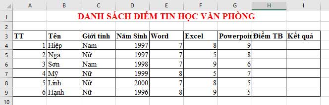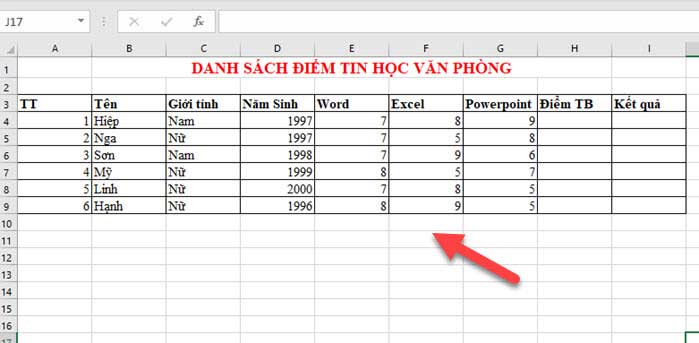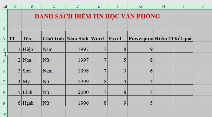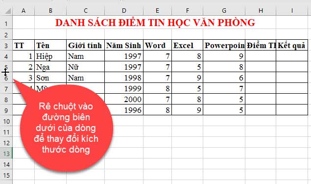 Lúc này bạn quan sát bảng tính, thì thấy tất cả những cột như: Năm sinh, Powerpoint và Điểm TB đã được giãn ra vừa với kích thước của 1 ô.