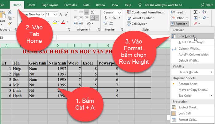 Bấm tổ hợp phím Ctrl + A để quét chọn toàn bộ bảng tính, sau đó vào Tab Home bấm vào Fomat và chọn vào Row Height.