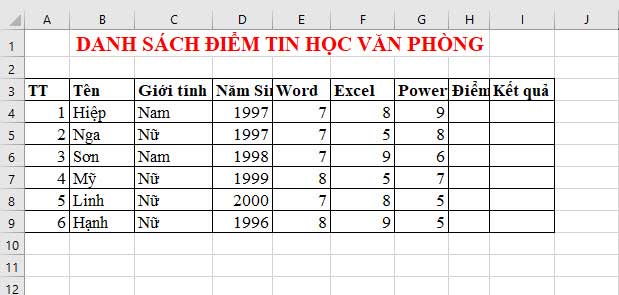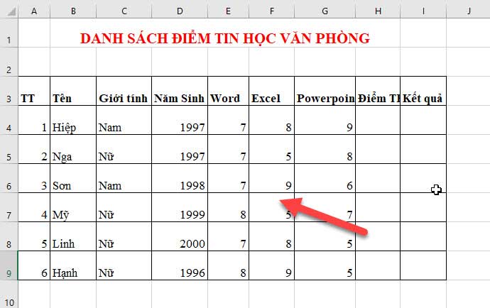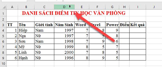 Giả sử như bảng tính của mình có các cột như: Năm sinh, Power point và điểm TB, có nội dung dài hơn kích thước của cột, nên dẫn đến bảng tính không hiển thị hết nội dung trong ô.