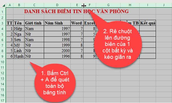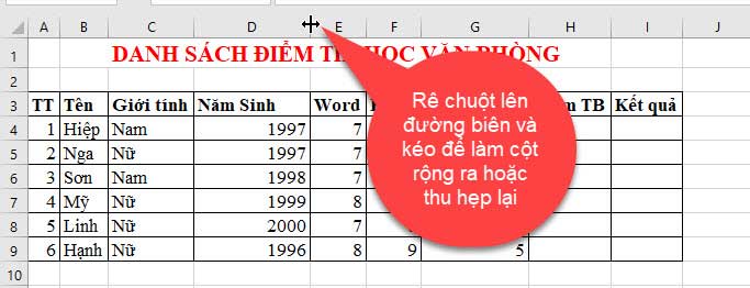 Rê chuột lên đường biên bên phải của cột, nếu kéo sang phải thì cột sẽ rộng ra, còn kéo qua trái thì cột sẽ thu hẹp lại