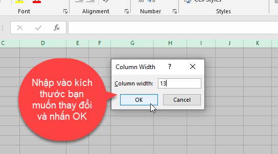 Nhập vào kích thước mà bạn muốn thay đổi độ rộng của cột, sau đó nhấn OK.