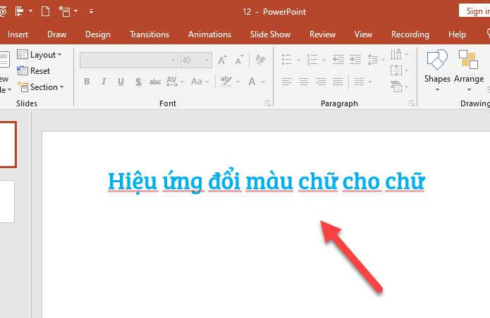 Giả sử như ở đây mình có nội dung là “ Hiệu ứng đổi màu cho chữ”, nội dung chữ ban đầu là có màu xanh nước biển. Bây giờ mình sẽ tạo hiệu ứng đổi màu cho chữ này, từ màu xanh nước biển thành màu đỏ khi trình chiếu slide.