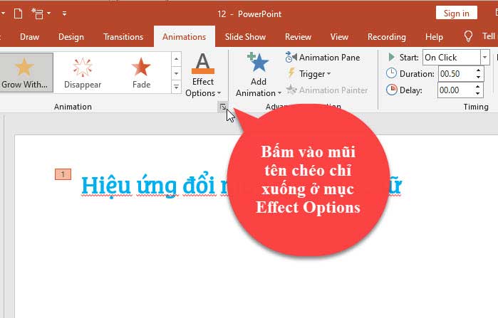 Để tuỳ chỉnh thêm cho hiệu ứng đổi màu cho chữ, bạn bấm vào mũi tên chéo chỉ xuống ở mục Effect Options