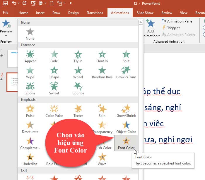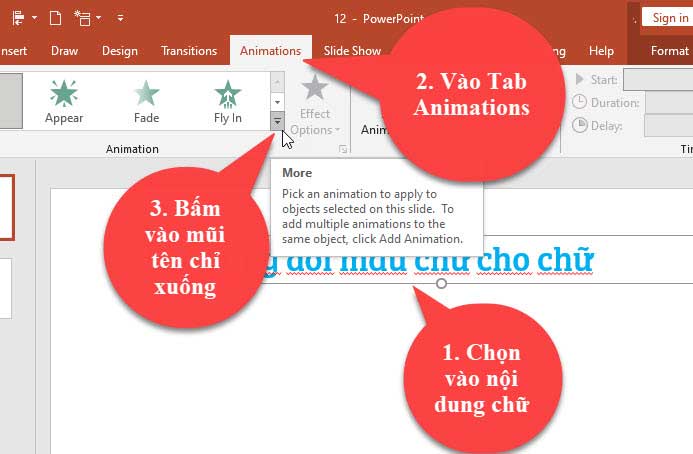 Đầu tiên chọn vào nội dung chữ muốn tạo hiệu ứng đổi màu, sau đó vào Tab Animations, tiếp theo bấm vào mũi tên chỉ xuống ở nhóm Animation.