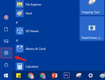Bước 1: Trước hết, chúng ta sẽ mở giao diện cửa sổ Windows Settings. Bằng cách nhấn chọn Start menu, rồi nhấn tiếp vào biểu tượng răng cưa.