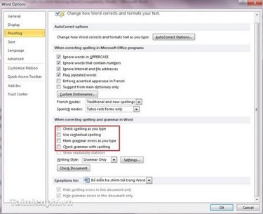 Cách 1: Để bỏ kiểm tra chính tả bạn bỏ chọn những mục sau rồi nhấn OK