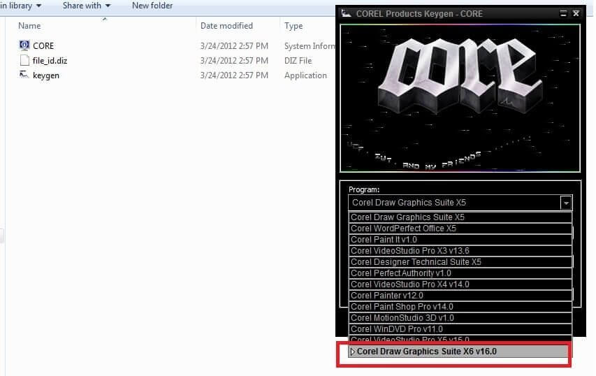 Bước 6: Tại ô Program của keygen, các bạn nhấn chọn đúng phiên bản phần mềm Corel X6 nhé