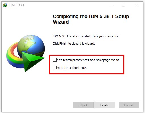 Bước 6: Đợi phần mềm chạy xong, sẽ xuất hiện hộp thoại mới. Bỏ tích chọn như hình bên dưới, sau đó bấm Finish để hoàn tất cài IDM trên máy tính.