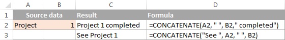 =CONCATENATE(A1,” ”,B1, “ completed”)