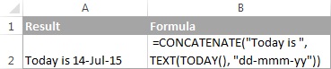 =CONCATENATE(“Today is “,TEXT(TODAY(), “dd-mmm-yy”))