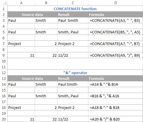 Kết nối các ô với dấu cách, dấu phẩy hoặc các kí tự khác.