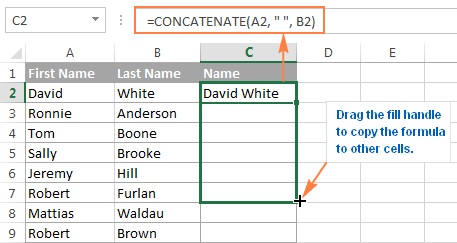 Ví dụ: =CONCATENATE(B2, “ “,C2)