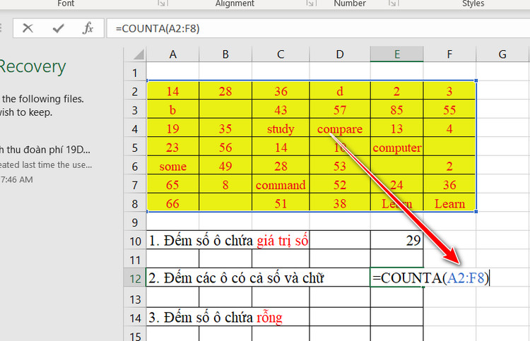 VD: =COUNTA(A2:F8)