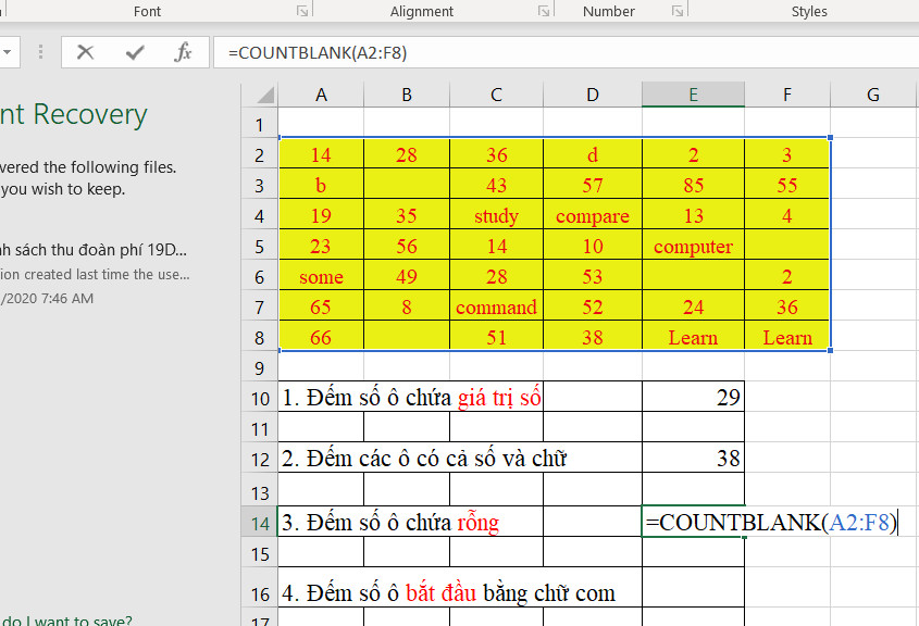 Như vậy nó đã trả về số lượng ô trống trong vùng dữ liệu được chọn.