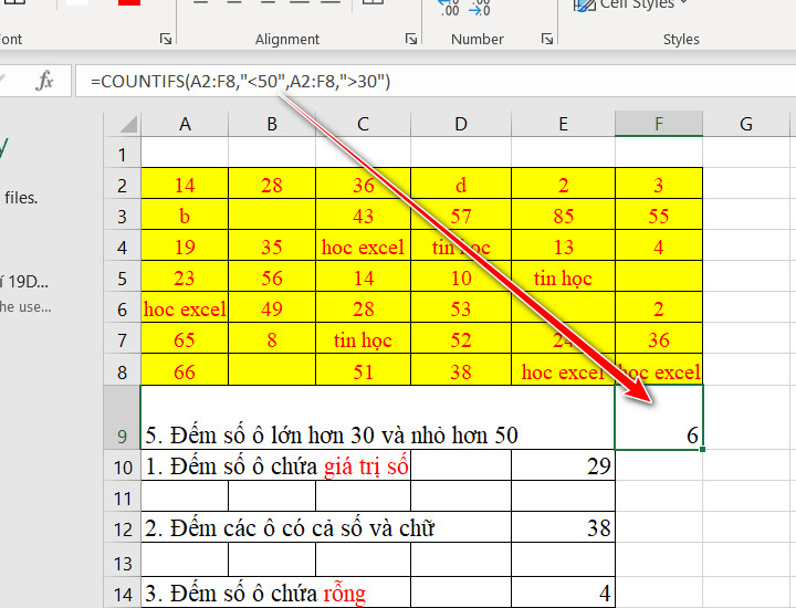 Vd: =COUNTIFS(A2:F8,”<50″,A2:F8,”>30″)