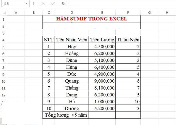 Nhiệm vụ, tính tổng tiền lương thực nhận cho nhân viên có thâm niên dưới 5 năm. Áp dụng công thức hàm sumif có điều kiện cho ô E15: =SUMIF(F5:F14,”<5″,E5:E14)