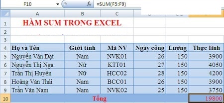 Áp dụng hàm sum để tính tổng số tiền lương thực lĩnh của nhân viên. Công thức áp dụng: F10=SUM (F5:F9) chọn giá trị tất cả từ ô F5 đến F9 bạn sẽ có kết quả hiển thị như: