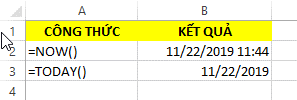 - Ví dụ: Bạn nhập công thức =Now() vào ô bất kỳ trong excel rồi nhấn enter. Bạn sẽ nhận được kết quả là ngày hiện tại