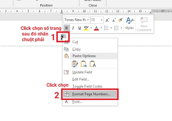 Bước 1: Sau khi đã chèn được số trang (ở phần II) bạn click chọn vào số trang sau đó nhấn chuột phải rồi chọn Format Page Numbers..