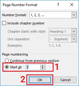 Bước 2: Hộp thoại Page Number Format hiện ra trong group Page numbering bạn tick chọn Start at sau đó nhập vào một số khác 1 (2 hoặc 3,..) sau đó nhấn OK.