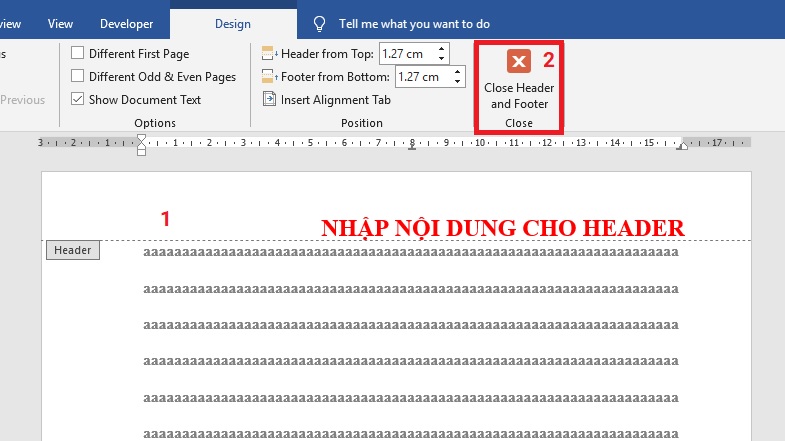 Bước 2: Nhập nội dung Tiêu đề hoặc chân trang sau đó nhấn vào Close Header and Footer hoặc click vào khoảng trống trong văn bản để ngừng chỉnh sửa.