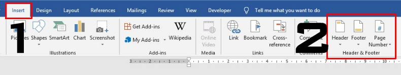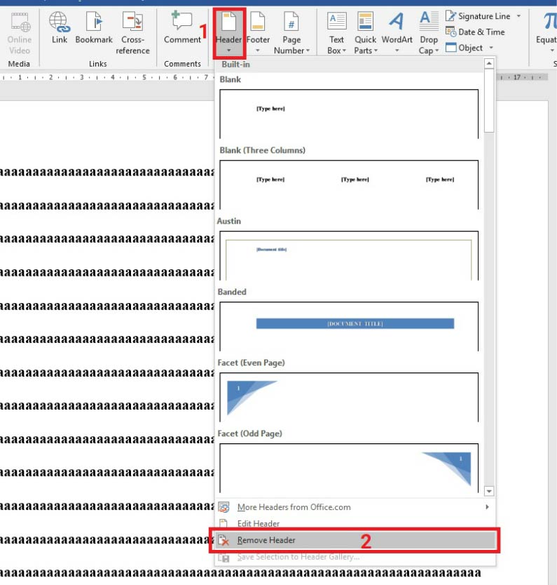 Bước 1: Trong văn bản của bạn click vào tab ribbon Insert trong group Header & Footer sau đó chọn Header hoặc Footer. (Hoặc bạn có thể click đúp vào tiêu đề “Header” hoặc chân trang “Footer” sau đó chọn Header hoặc Footer