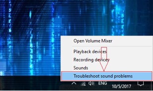 Đây là 1 tính năng được Windows 10 tích hợp từ đầu giúp người sử dụng dễ dàng tìm và sửa lỗi những vấn đề liên quan tới âm thanh. Để mở tính năng này, người dùng click chuột phải vào biểu tượng âm thanh trên thanh Taskbar, chọn tiếp Troubleshoot sound problems như hình dưới.