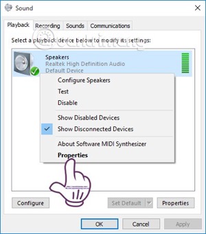 Bước 1: Cũng tại biểu tượng âm thanh trên màn hình, nhấp chuột phải và chọn Playback devices. Sau đó tại giao diện thiết bị âm thanh đang sử dụng chọn Properties như bước 1 và 2 ở cách 3 bên trên.