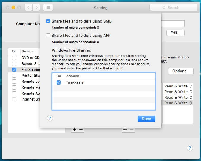Nhấn Options…, đảm bảo chọn SMB sharing được bật và AFP sharing bị tắt (vì máy Ricoh thường chỉ tương thích tốt với SMB).