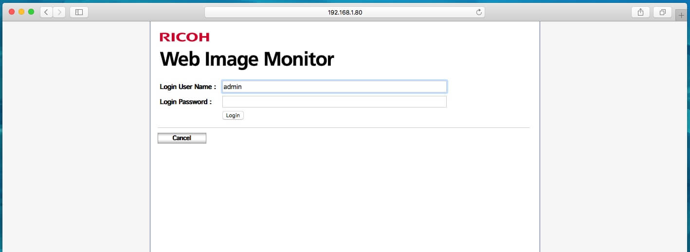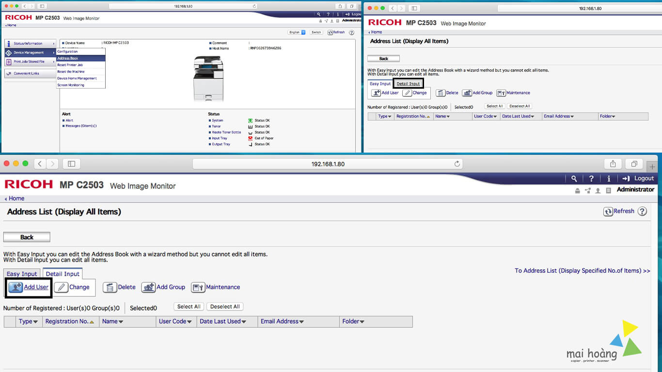 - Trên máy Ricoh: truy cập giao diện web qua trình duyệt gõ địa chỉ IP của máy Ricoh (ví dụ: