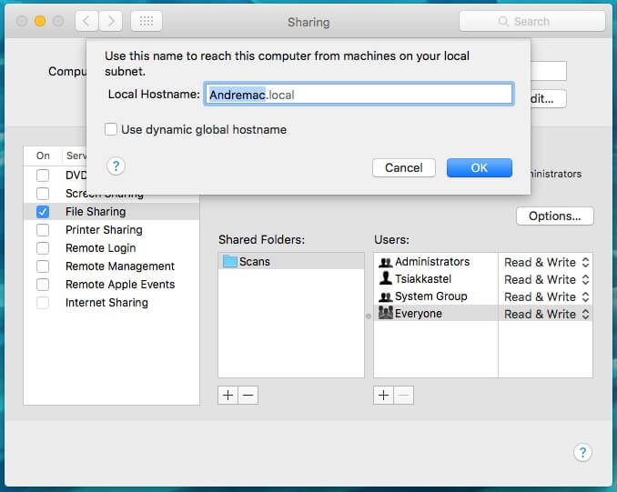 Nhấn Edit… ở phần Computer Name nếu muốn đổi tên máy sao cho dễ nhớ — ví dụ đổi thành “Andremac”.