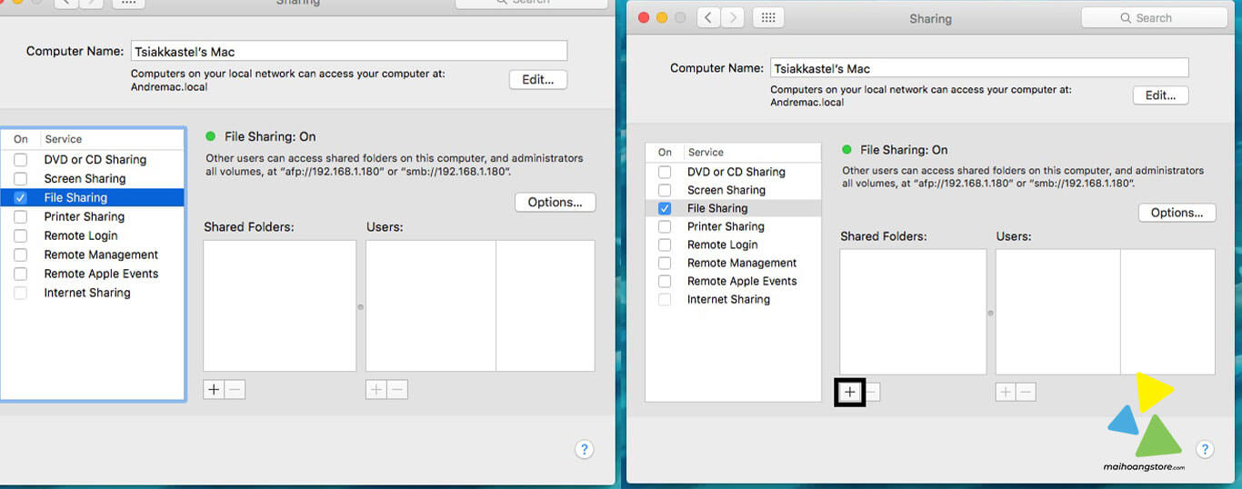 Nhấn dấu “+” dưới mục Shared Folders, điều hướng tới ổ Macintosh HD → chọn thư mục Scanner vừa tạo → nhấn Add.