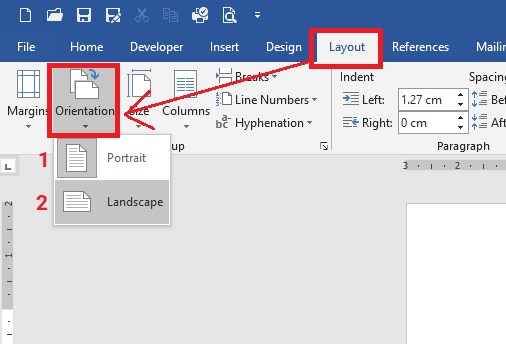 Chọn tab Layout, sau đó chọn tiếp mục Orientation trong menu thả xuống bạn chọn Portrait (in dọc) hoặc Landscape (in ngang).