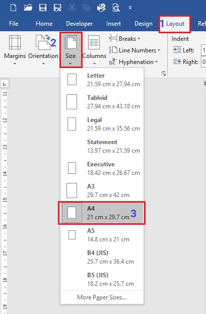 Chọn tab Layout, sau đó chọn tiếp mục Size trong menu thả xuống bạn chọn A4 (21cm – 29.7cm).