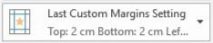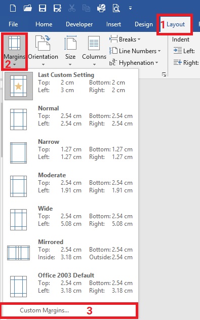 Lề của trang giấy là khoảng cách tính từ mép giấy tới nội dung của trang. Để đặt lề cho trang, bạn vào ribbon Layout. Tại đây, trong group Page Setup bạn chọn mục Margins rồi trong menu thả xuống, bạn chọn Custom Margin