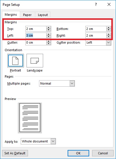 Trong group Margins bạn đặt lề cho trang giấy rồi nhấn OK. Nếu bạn in ra và đóng gáy thì nên đặt lề trái là 3cm