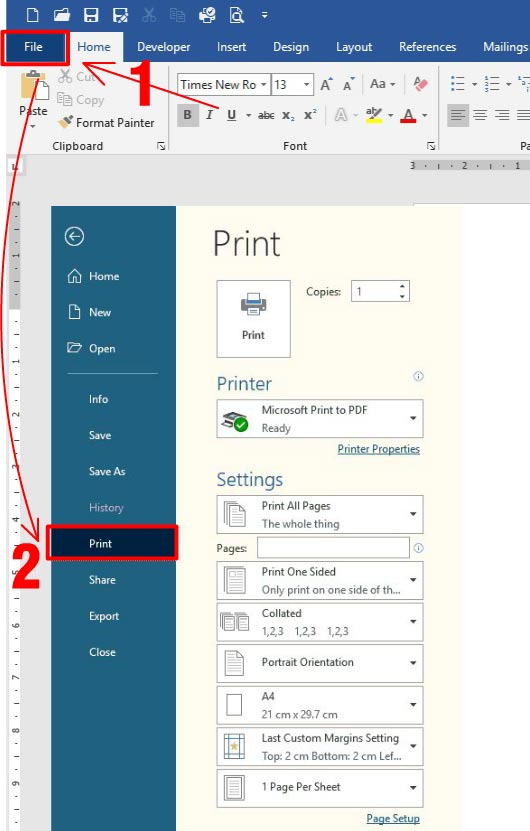 Chọn tab File, sau đó chọn tiếp mục Print (Hoặc sử dụng phím tắt Ctrl + P)
