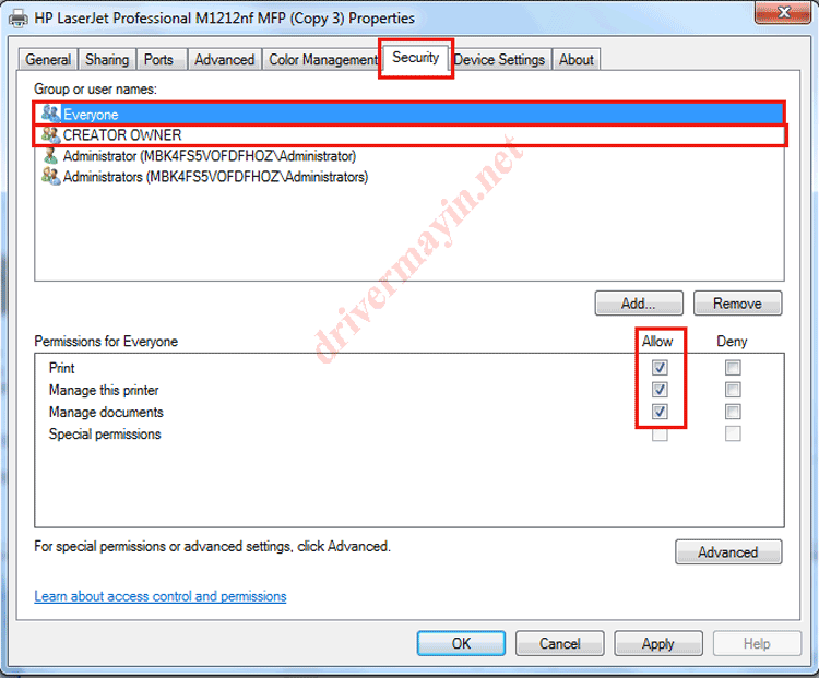 Chọn lần lượt vào User Everyone và Creator Owner chọn full quyền sau đó nhấn Apply rồi nhấn Ok.
