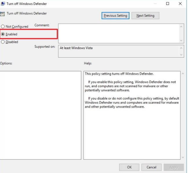 5. Chọn Enabled để vô hiệu hóa Windows Defender.