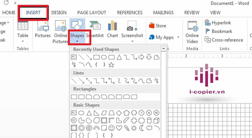 Hầu hết công cụ chúng ta có thể sử dụng đều nằm trong nhóm Illustrations ở tab Insert. Click vào Shapes – nơi chứa tất cả khối hình cơ bản cho một sơ đồ tư duy.