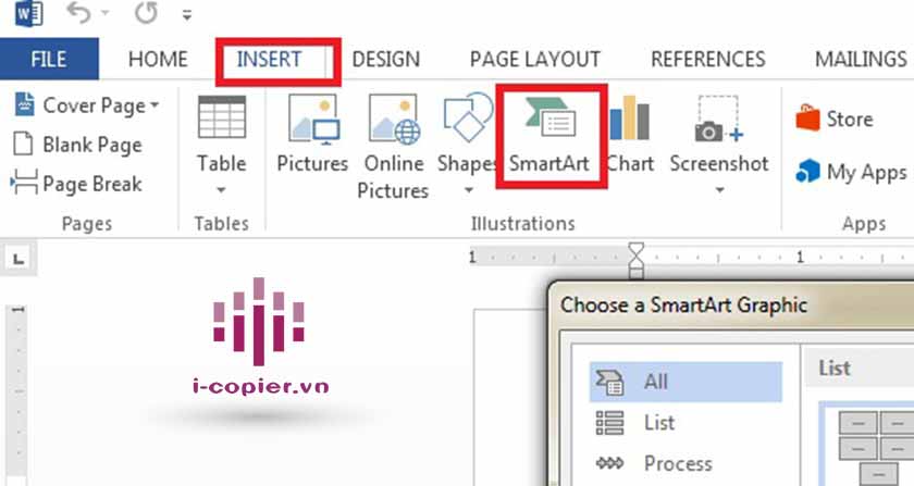 • Bước 1: Vào Word → Chọn Insert → Chọn SmartArt