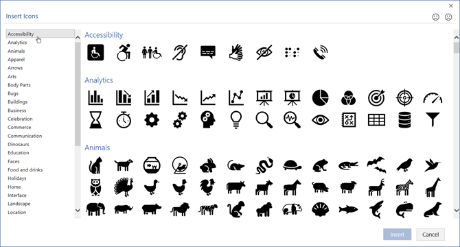 Tới Ribbon > Insert > Illustrations Group > Icons