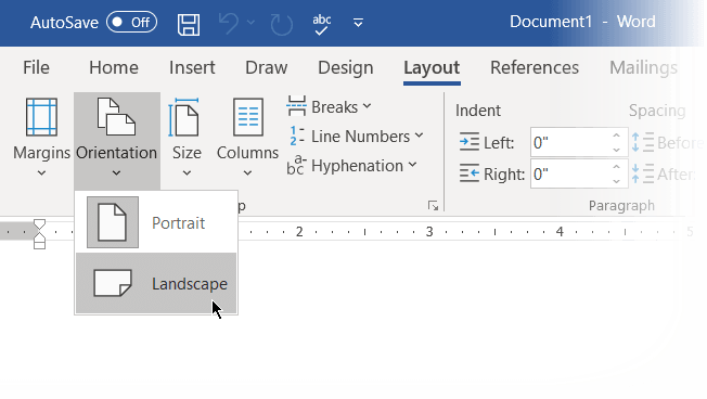 Chế độ này cung cấp vùng làm việc tối đa theo chiều ngang. Trong New Word Document, chọn Layout > Orientation > Landscape. Nếu cuối cùng bạn muốn in nó, hãy chọn Size ở nhóm Page Setup.
