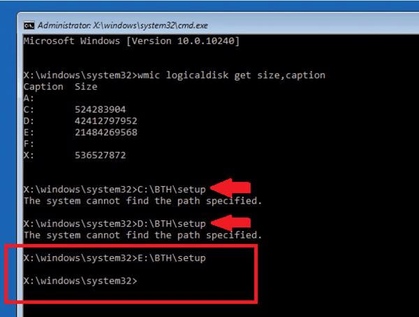 Lúc này các bạn sẽ gõ theo cấu trúc của tên ổ cứng BTHsetup, chạy từ C, D, E, F, G, K,… cho tới khi dòng The system cannot find the path specified này không còn hiện lên thì cửa sổ Windows Setup đã xuất hiện.