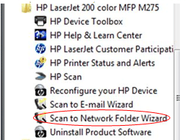 Bước 2: Chọn thư mục HP LaserJet Pro M200, M300, M400 (ví dụ bên dưới là máy HP M275) và chọn Scan to Network Folder Wizard.