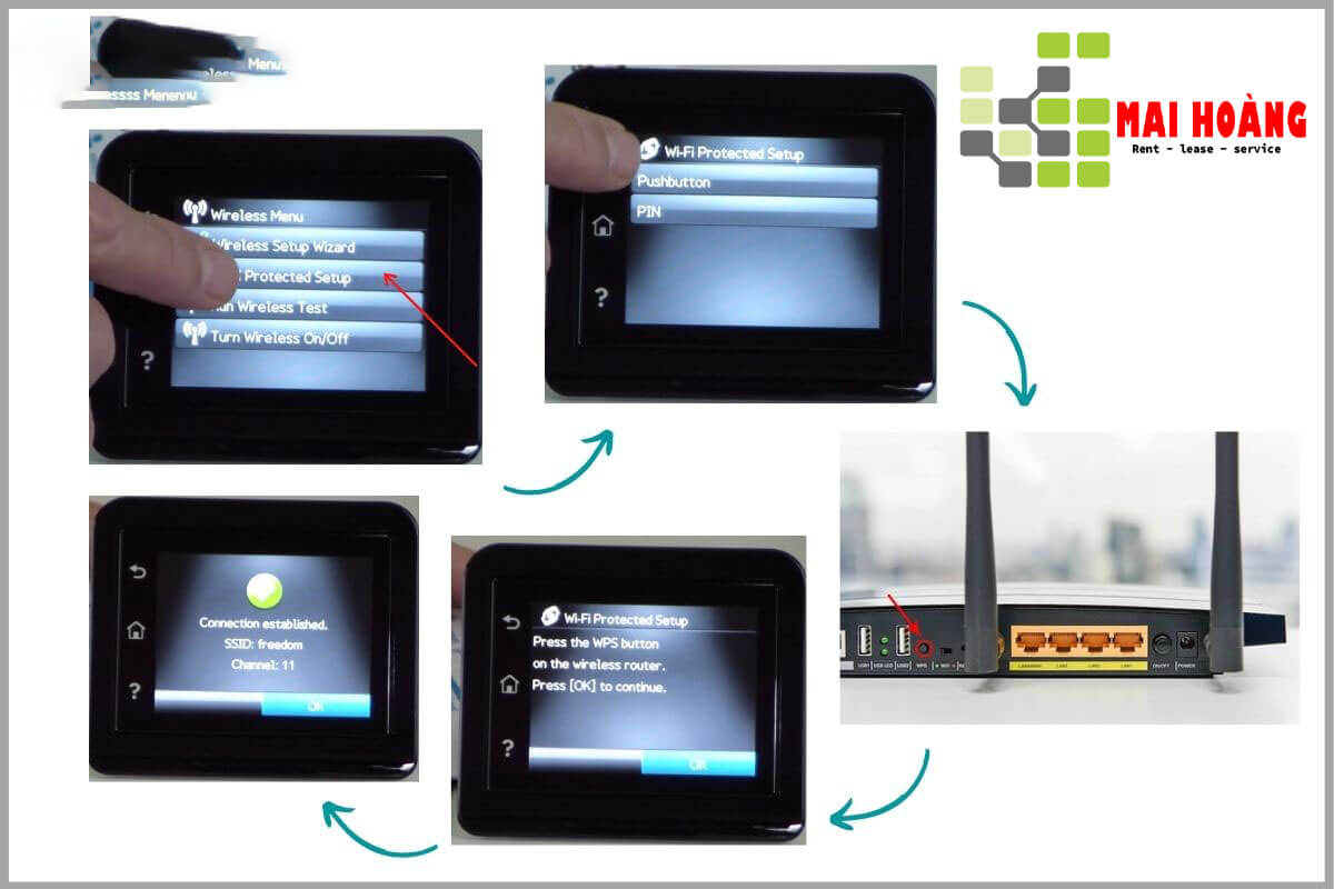 6. Bước 6: WiFi Protected Setup → chọn Pushbutton và bấm vào nút WPS trên cục Router và nhờ đó mà bạn không cần phải nhập tay ID và mật khẩu WiFi → nhấn OK
