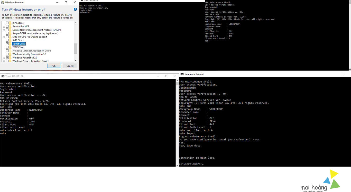 telnet <IP máy photocopy>(ví dụ:telnet 192.168.1.70) và nhấn Enter. -