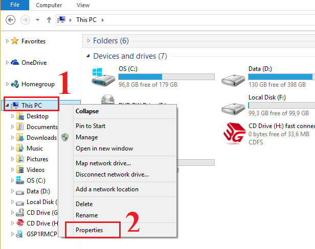 Đầu tiên các bạn mở My computer (hoặc This PC trên Windows 8) lên bằng cách nhấp tổ hợp phím windown + E hoặc mở thông thường, tại đây bạn nhấp chuột phải vào My computer (hoặc This PC trên Windows 8) chọn Properties